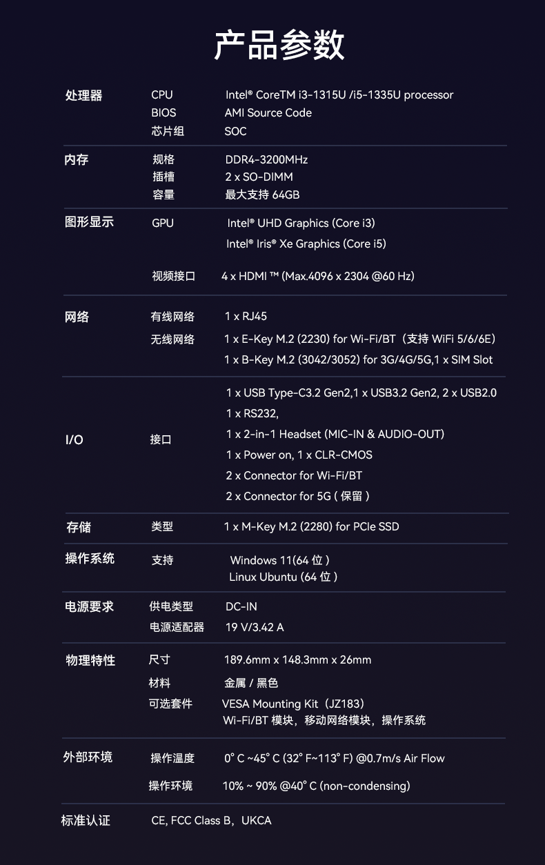非凡科技D613采用英特尔Raptor Lake酷睿i3-1315U/i5-1335U 处理器,作为一款性能强悍的主机,它的TDP仅15W,能有效降低能耗,延长电池寿命。在内存方面,D613采用2 x SO-DIMM DDR4-3200 MHz,最大可达64GB,并配备1 x M-Key M.2 (2280) for PCIe SSD。
