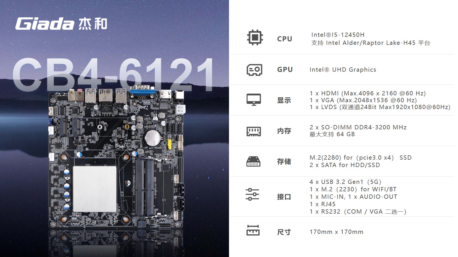 CB4-6121主板搭载了强大的12代Intel Core i5-12450H处理器,支持Intel Alder/Raptor Lake-H45平台,这颗CPU采用Intel 7制程工艺,8核12线程设计,最大加速功耗高达95W,以及12M高速缓存,为用户提供超强的计算能力和响应速度。无论是处理日常办公任务还是享受高清游戏,CB4-6121都能轻松胜任。