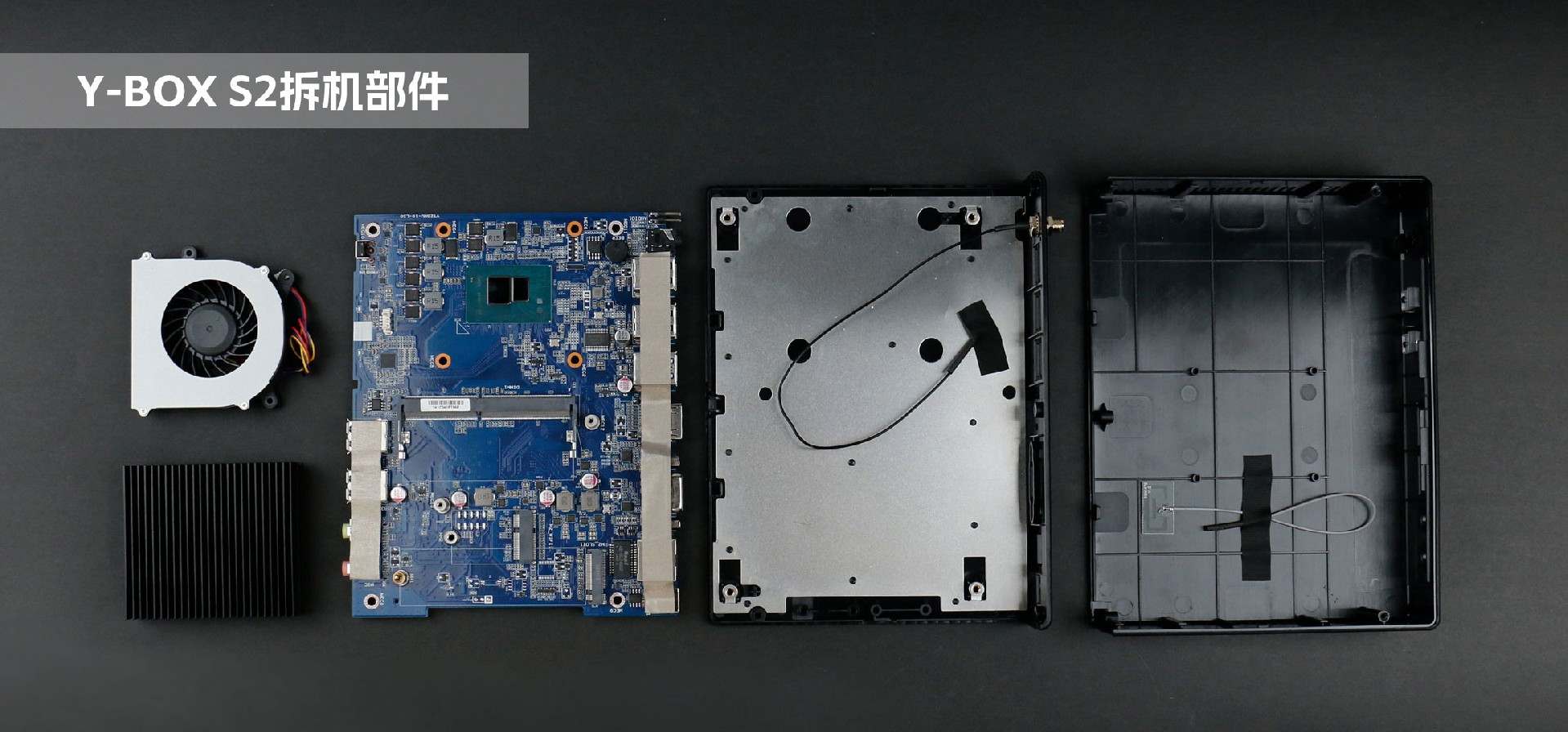 非凡桌面云终端Y-BOX S2机壳由两片式塑胶壳组合而成,整机由上至下主要分为三个部分:顶部外壳、内部主板、底部外壳。底部外壳内附一层铝板防静电,以防主板被静电损坏。主板处理器顶部安装一体式铝板鳍片,并涂抹一层散热膏用于导热,提高散热强度。同时,主板中部安装强劲的风扇用于散热,降低内存与硬盘读取时受温度的影响,提高运行稳定性。