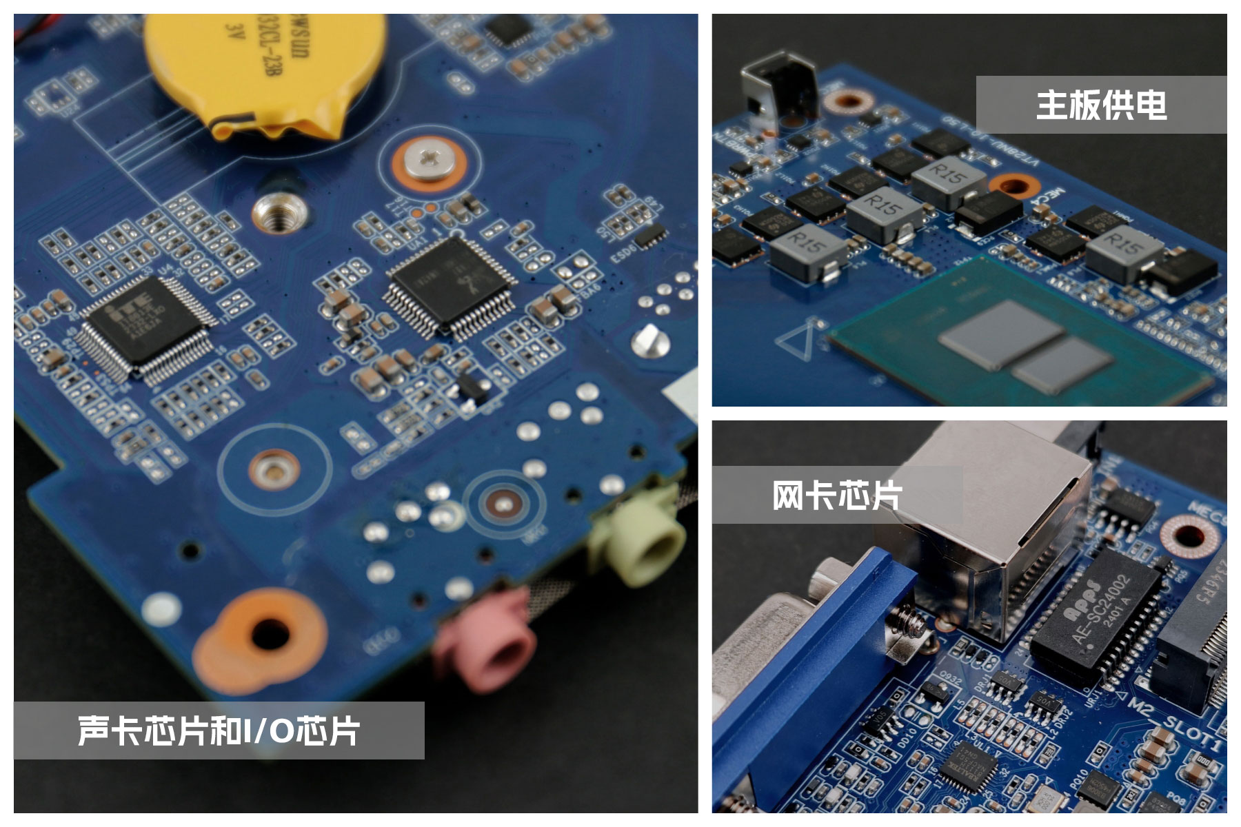 非凡桌面云终端Y-BOX S2主板采用的是3+1相供电,在主板两侧的接口附近,都分布了相关的芯片。在千兆网口附近有1个网卡芯片RTL 8111H,在主板背面的音频接口附近可以看到一个经典的“小螃蟹”ALC897 声卡芯片,声卡芯片附近有一个I/0 芯片HE8613E-LX。