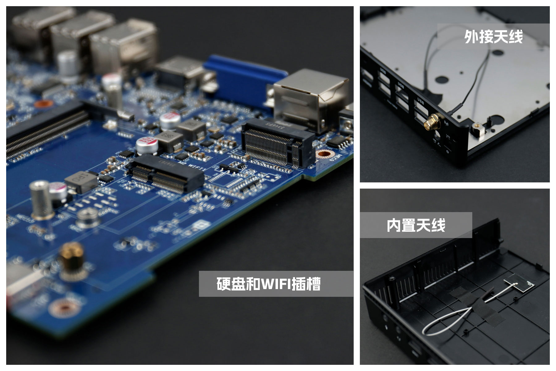 非凡桌面云终端Y-BOX S2主板上配备了 1个 M.2 固态硬盘位,接口规格为 PCIe3.0 标准,匹配标准的 2280 规格硬盘。一侧还有一个M.2接口,匹配2230长度的WIFI/BT模块插槽,WiFi模块可以连接的是外接天线,增强信号,同时也可以内接天线,灵活应用,支持Wi-Fi 5/6/6E网络。
