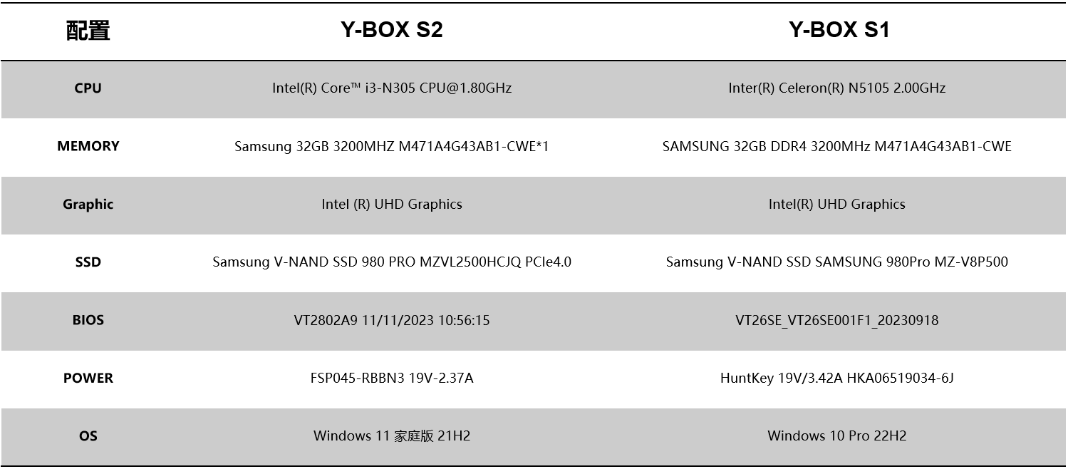 针对桌面云终端Y-BOX S2的测试项目中,最值得关注的是性能测试的跑分数据和稳定性测试内容,这能直观影响主机在使用过程中的稳定性和用户的使用体验。针对性能测试,非凡选择了将Y-BOX S2与前一款更迭产品Y-BOX S1进行对比分析,Y-BOX S2支持Intel® Alder lake-N处理器,Y-BOX S1支持Intel® Jasper Lake,并分别选取了以下配置: