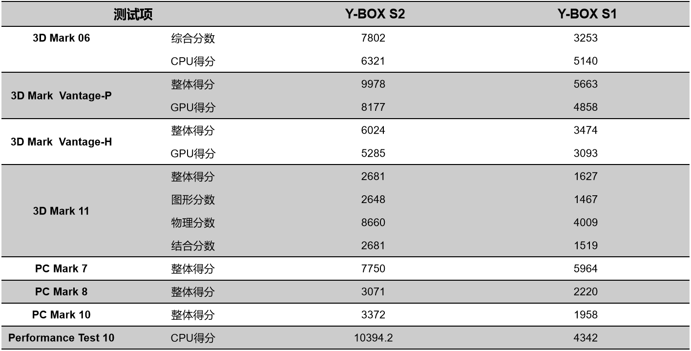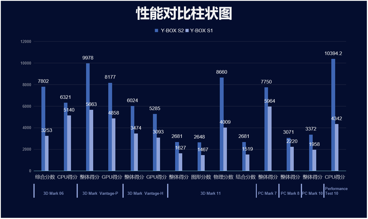 非凡来具体看看各个测试项目的跑分情况,测试项目包括显示性能测试、系统性能测试、CPU性能测试,分别用3D Mark、PC Mark以及Performance 10等系列不同软件的跑分数据,针对两款主板的跑分情况可以看出,非凡桌面云终端Y-BOX S2的数据在各项性能上都得到了大幅度提升,柱状图能更直观地体现出数据的变化,非凡将针对具体的几项数据来进行详细分析。