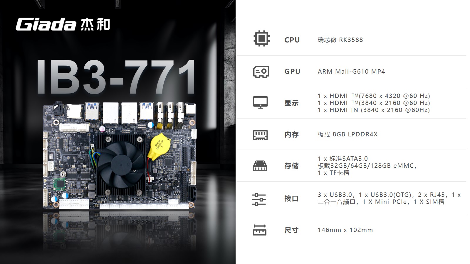 非凡工业级ARM主板IB3-771采用瑞芯微RK3588处理器,内置G610 MP4 GPU,拥有6 TOPS算力的NPU,支持8K视频硬件解码编码及多摄像头输入,支持eDP/DP/ HDMI2.1/MIPI 多种显示接口。