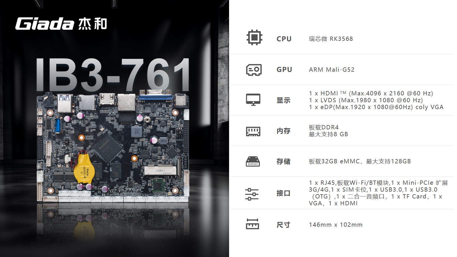 非凡工业级ARM主板IB3-761基于瑞芯微RK3568四核64位处理器开发。内置1TOPS算力的NPU,满足轻量级端侧AI计算应用。