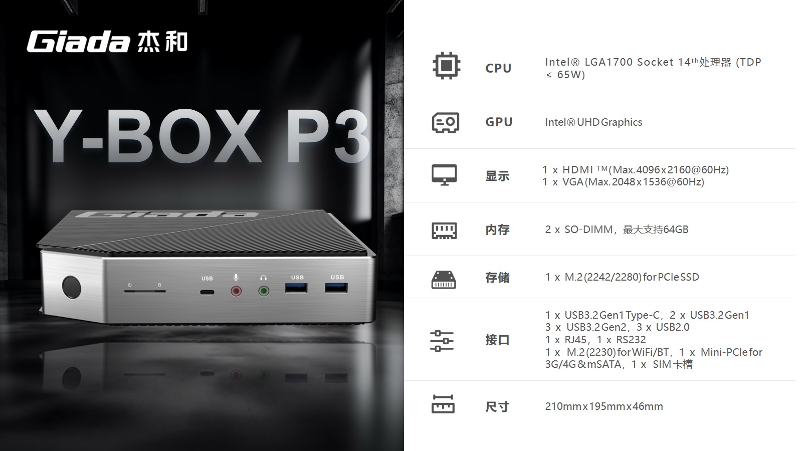支持指纹解锁,支持type-c接口,支持PD协议的27W快充。非凡科技最新云终端Y-BOX P3采用Intel® LGA 1700 Socket CPU插槽设计,支持intel 12~14代酷睿系列处理器,配备i7-14700处理器,20核28线程,最大睿频频率为5.4GHz,处理器基础功耗 65W。采用双通道笔记本内存槽设计,最大支持容量可达64GB,最高支持DDR5-5600MHz频率,比 DDR4 至高标准数据速度 3200MT/S多传输 1.75 倍。