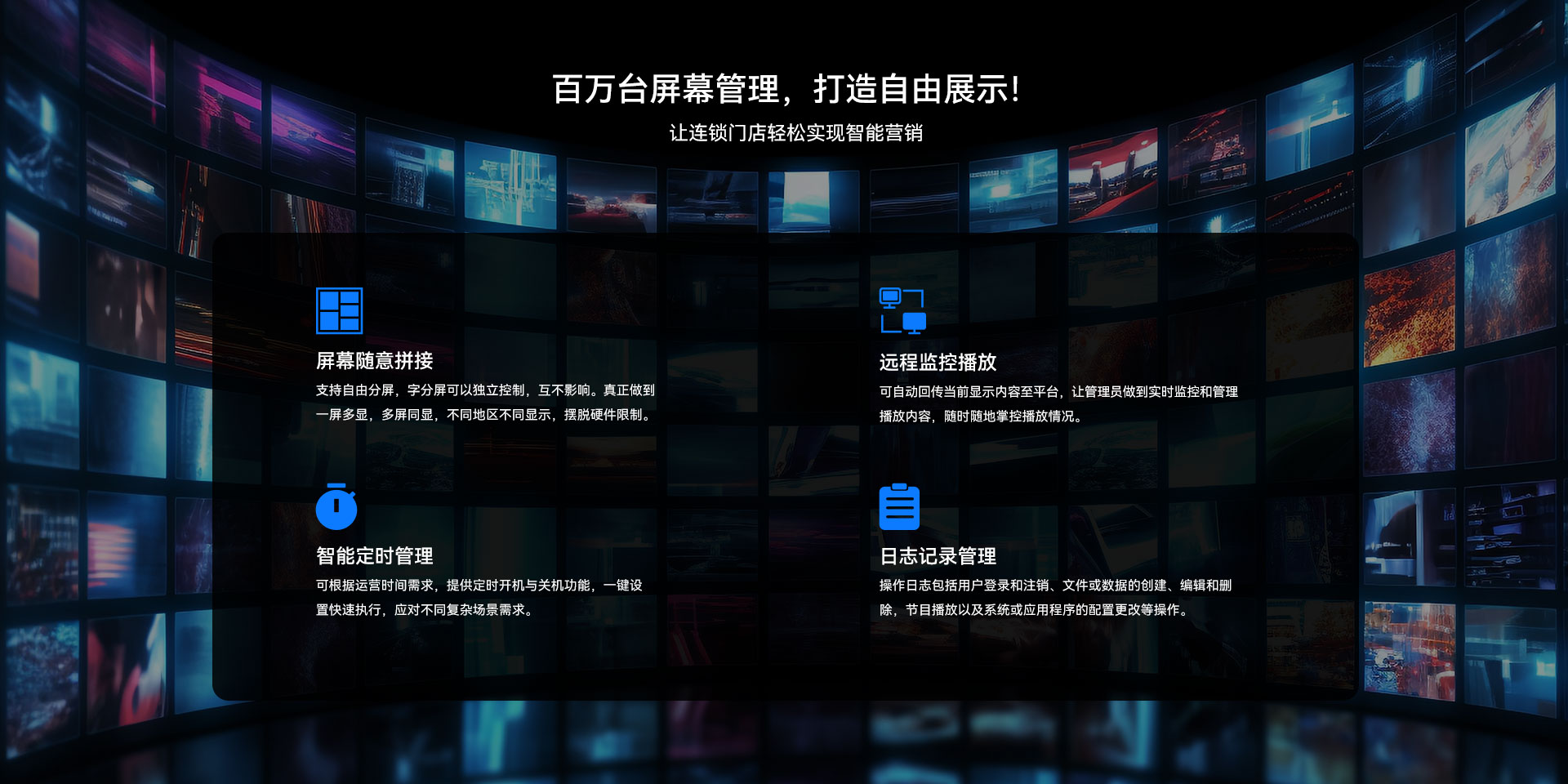 为此,非凡科技打造一整套数智化信息管理系统,该系统由服务器(后台)管理端和设备播放端组成,运用显示屏将企业宣传、广告展示、紧急通知等信息全面展示在大众面前。通过将音视频图文、网页资讯、时间天气、字幕等多样化内容的组合,形成一段精美的节目,并使用网络作为载体,随时将制作好的节目推送到各地的媒体设备上进行播放。
