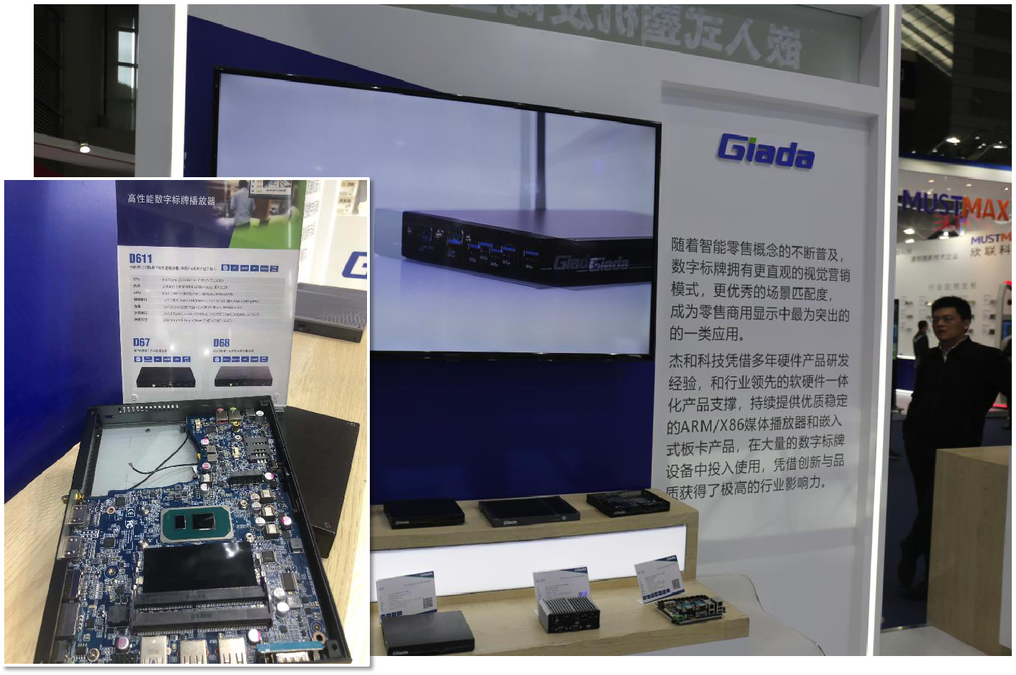 步入非凡科技展位,首先呈现的是非凡科技近年的商用显示ARM产品集和GDSM广告精准推送演示。非凡科技DN系列媒体播放器分别使用了瑞芯微RK3288、RK3328和RK3399三款核心芯片;全部采用116mm*107mm*30mm的紧凑外观设计,轻便灵活;搭载RK3399的DN74媒体播放盒具备双屏4K异显输出能力,DN75在DN74的基础上额外扩展了HDMI-in视频输入接口,支持画中画或投屏显示。非凡科技现场布署的所有单个屏幕都由DN系列媒体播放器作为信号源,GDSM智能零售管理系统下发的广告信息通过后台推送,再现了零售场景下如何管理多个分散布署的广告屏。