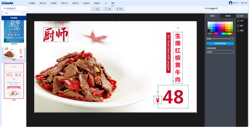 非凡科技智慧餐厅综合解决方案是由智能零售管理系统搭载公司自研的数字标牌播放器组成的软硬件一体化方案。该系统针对餐厅、酒店等不同行业提供典型节目模板,支持手机、电脑建议操作。用户只需3步即可完成节目的制作播放:选择节目模板,更换自己的素材(视频、图片和文字),预览保存及播放。价格、优惠折扣等信息可随时更改。