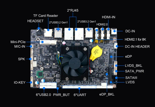 内部接口支持6 x USB2.0,1xeDP,1xLVDS,1xMIPI-CSIjack,2 x RS232 header,2 x RS485 header,2 x TTL,1 x IO-KEY, 1 x IR,1 x MIC-IN,1 x SPK等接口。