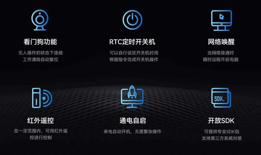 非凡主板IB3-771配置了无人值守专利技术,大力降低因高算力带来的能源消耗,该技术通过定时开关机、看门狗计时器、RTC宕机自检、红外遥控和局域网唤醒等功能实现主板绿色运行。