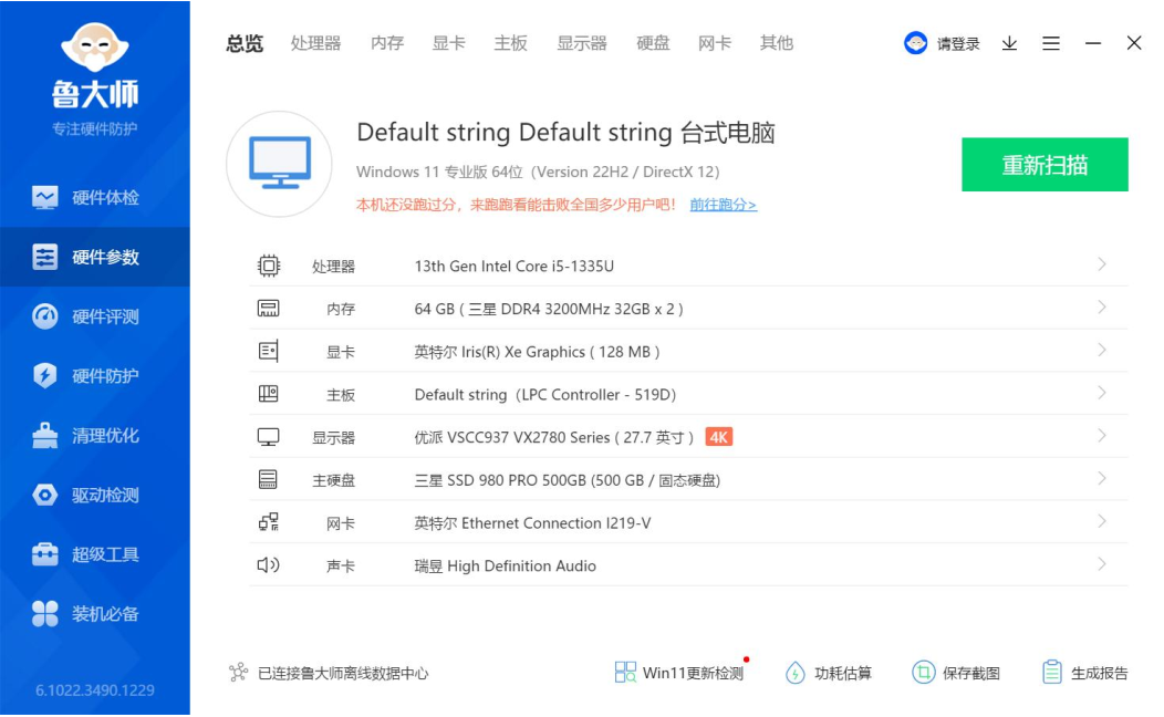 上面是鲁大师识别的非凡AE613硬件参数详情,非凡进行跑分测试的核心三大件选择的是13th Gen Intel(R) Core(TM) i5-1335U @1.30GHz处理器,Intel(R) Iris(R) Xe Graphics显卡,三星 32GB*2 DDR4 3200MHz内存,三星SSD 980 PRO 500GB(500 GB/固志硬盘),下面非凡来看详细的跑分数据。