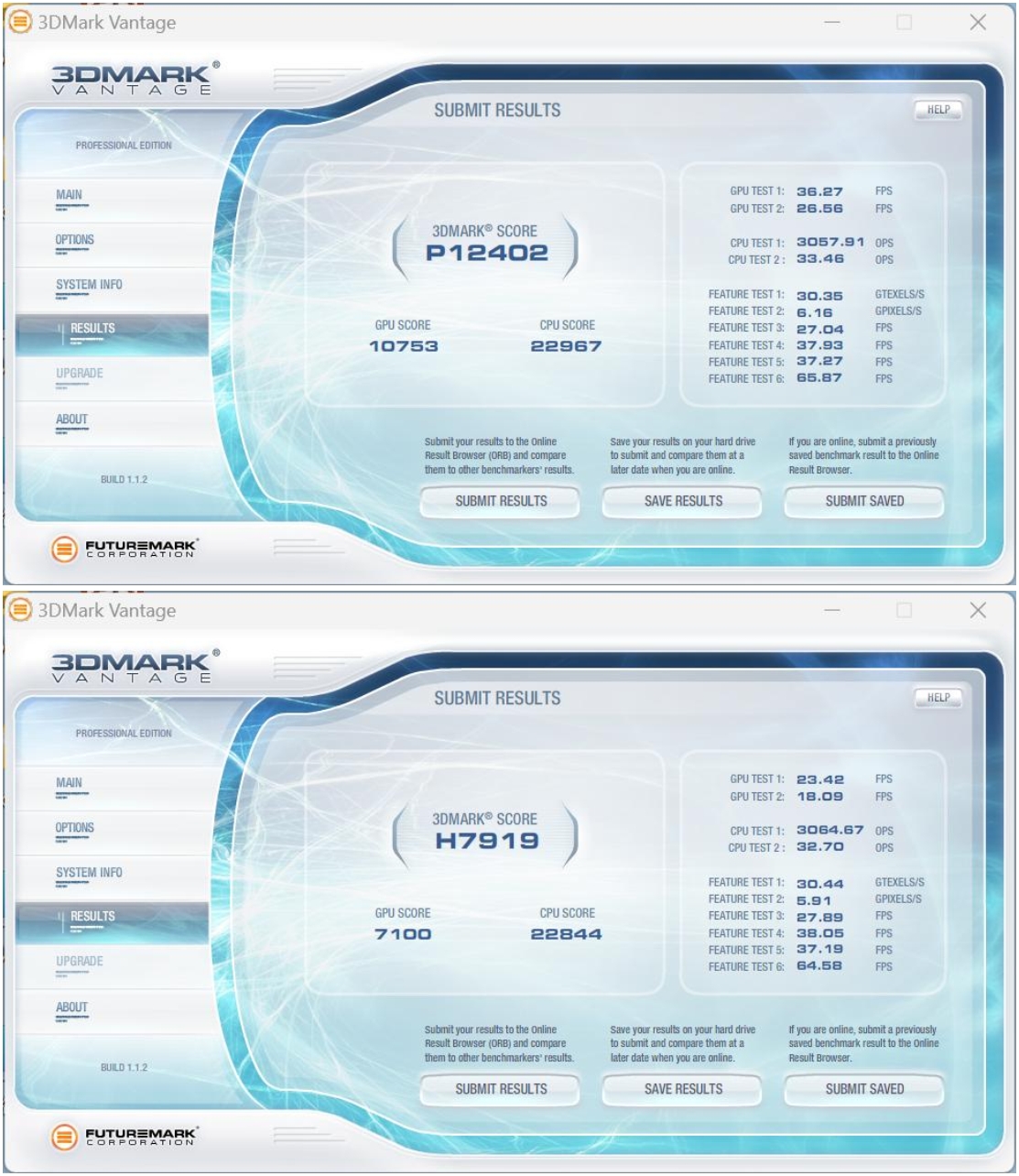 3DMark Vantage一款3D图形性能评测软件,主要用于评测电脑的显卡和处理器的性能。非凡按照画质等级,记录了性能级(Performance,P)和高端级(High,H)两份数据。其中,Performance的综合得分为P12402,High的综合得分为H7919,表现不错,这个成绩已经完全能够满足主流用户的需求了。