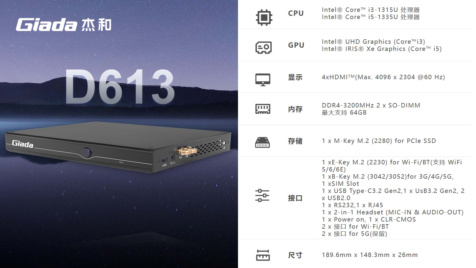 非凡科技D613可选配Intel®第13代AlderLake i5-1335处理器,作为家用迷你主机来说,足够大的内存容量也可以提升迷你主机的性能表现,更好地支持多任务处理,大型应用程序的运行以及高清视频编辑等任务,拥有的2个SO-DIMM插槽,内存DDR4最大支持64GB的内存容量可以减少系统对硬盘的依赖,提高系统的响应速度。