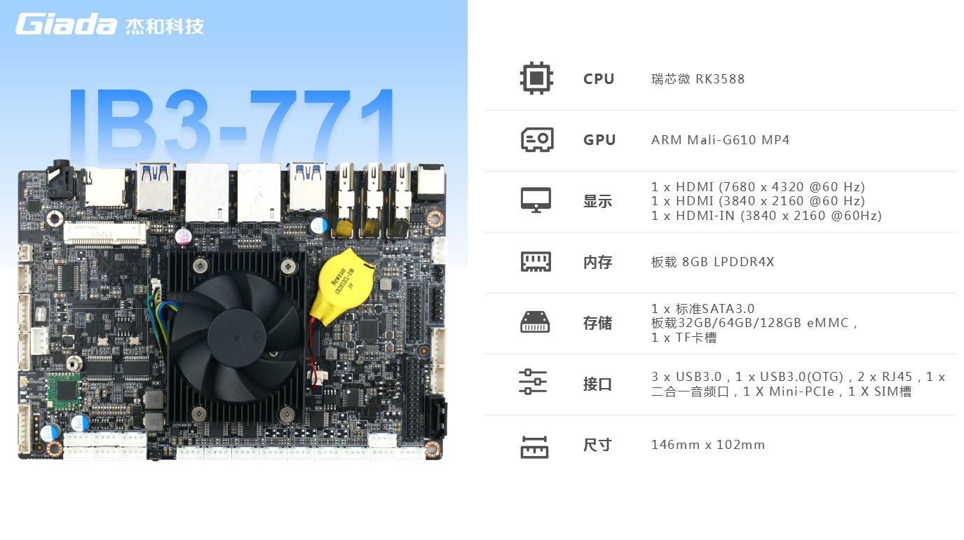 非凡主板IB3-771内置瑞芯微新一代旗舰级高端芯片RK3588,6TOPS算力的NPU,具有高算力、内存大、超强多媒体、多重扩展等技术优势。支持主流深度学习框架,能够为各类养老 AIOT 应用场景提供更优的性能表现。